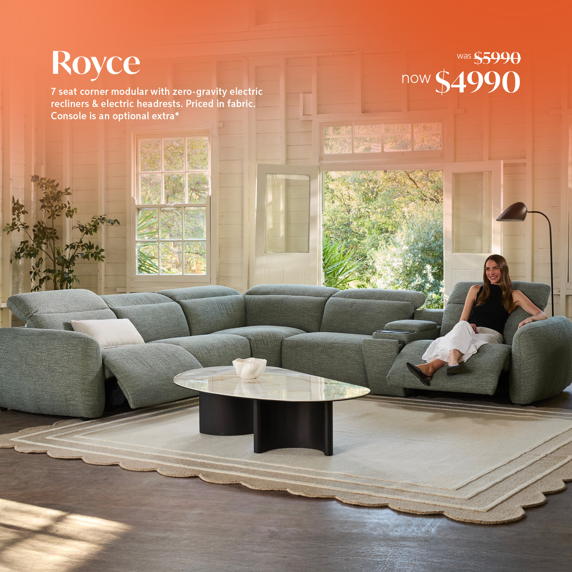 royce 7 seat corner modular with zero-gravity electric recliners & electric headrests with console